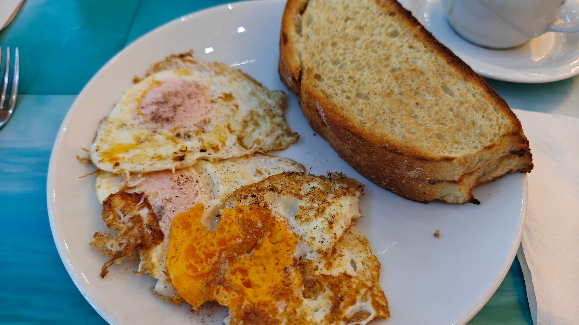 Nach einem letzten guten Frühstück geht's in 9:46 los, da zwei Personen noch länger Kaffeetrinken mussten.